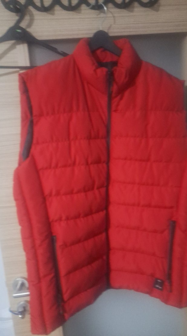 Kırmızı, fermuarlı cepli, yüksek yakalı ve parlak görünümlü, dar kesim erkek yelek.