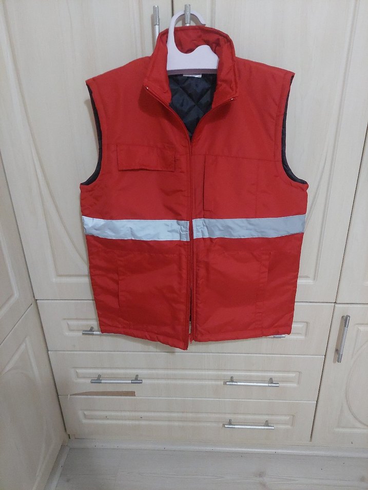 Yüksek yakalı, fermuarlı ve kolu olmayan erkek yeleği. Canlı kırmızı renkte, yumuşak ve sıcak kumaştan, reflektörlü yatay şeritli. Günlük sokak stiline uygun, normal boy en 58 boy 69 cm sıfır paketli