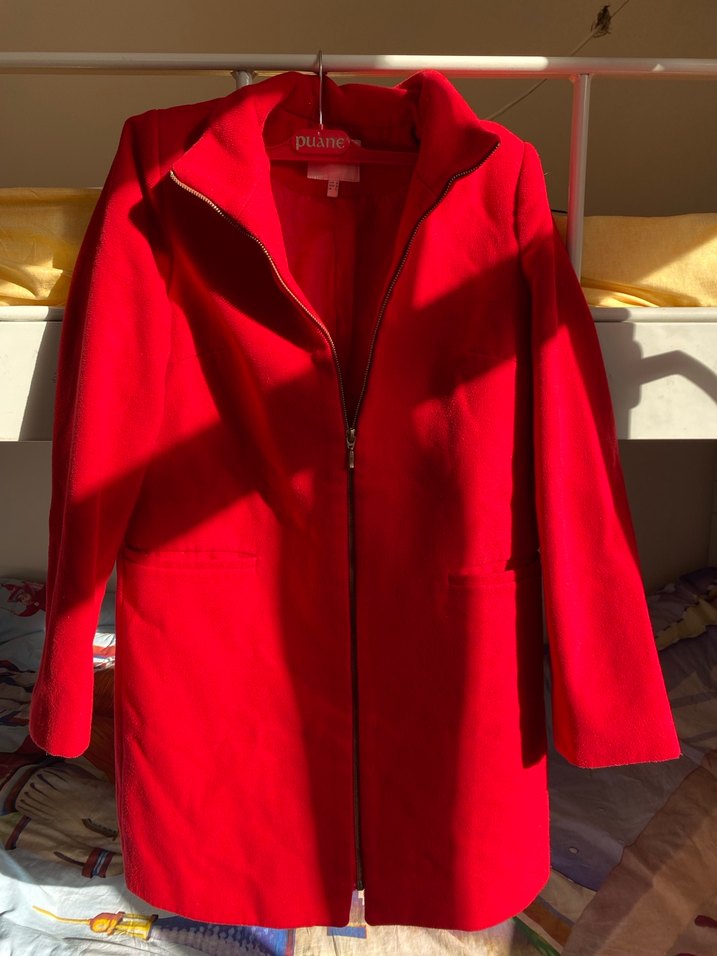 Önden fermuarlı, yüksek yakalı ve uzun kollu kırmızı kaban. Soğuk havalar için sade ve şık tasarım.