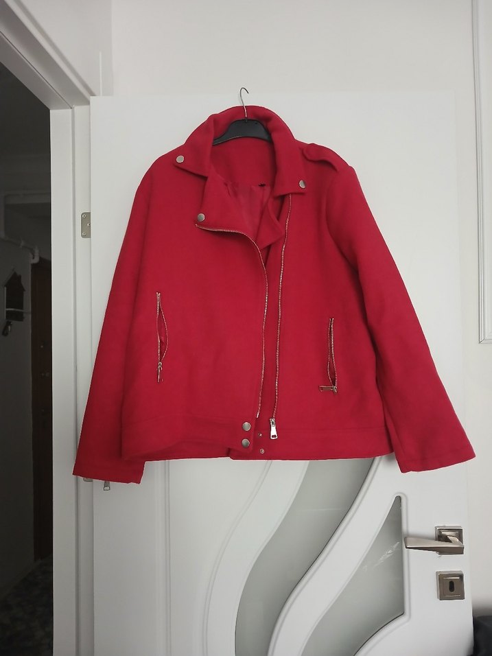 Kırmızı biker ceket, çıtçıtlı yaka, uzun kollu ve bol kesimdedir. Fermuarlı cepleri ve ön kapanışı vardır, yumuşak ve rahat kumaştan yapılmıştır.