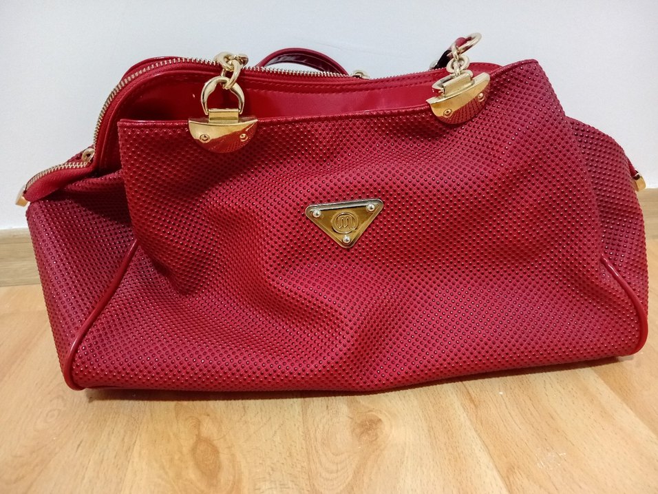 Kırmızı parlak sentetik kumaştan fermuarlı kadın çanta, altın detaylarla klasik şıklığı ve sokak stilini birleştirir. Günlük kullanıma uygundur.