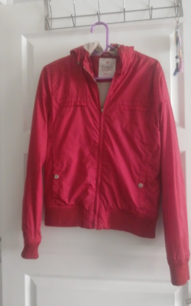 Fermuarlı, uzun kollu ve kapşonlu bu kırmızı ceket, parlak görünüme sahip ve normal boyda. Rahat ve sıcak kumaşıyla günlük kullanıma uygundur.