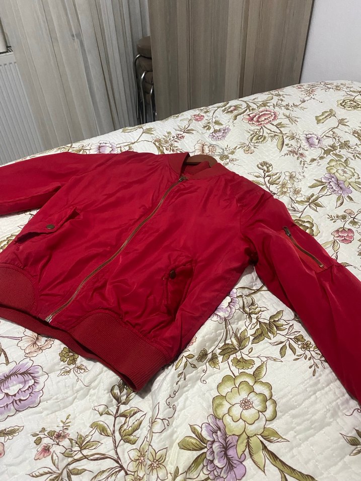 Kırmızı, fermuarlı ve yüksek yakalı bu kadın ceket, sokak stiline uygun ve vücuda oturan kesimdedir. Uzun kollu ve midi boyda, sentetik kumaştan üretilmiştir.