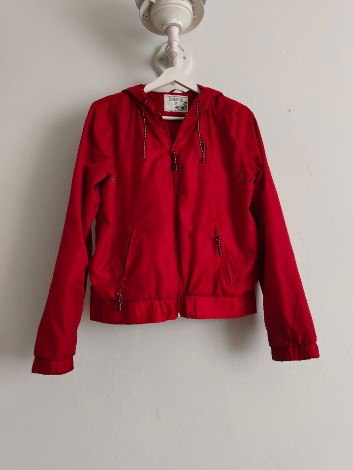 Fermuarlı, uzun kollu ve parlak kırmızı kumaştan yapılmış, normal uzunlukta dar kesim kadın ceket. kol arkasında ufak bir deformesi var onu kumaşla kapattım onun dışında bir sorunu yoktur