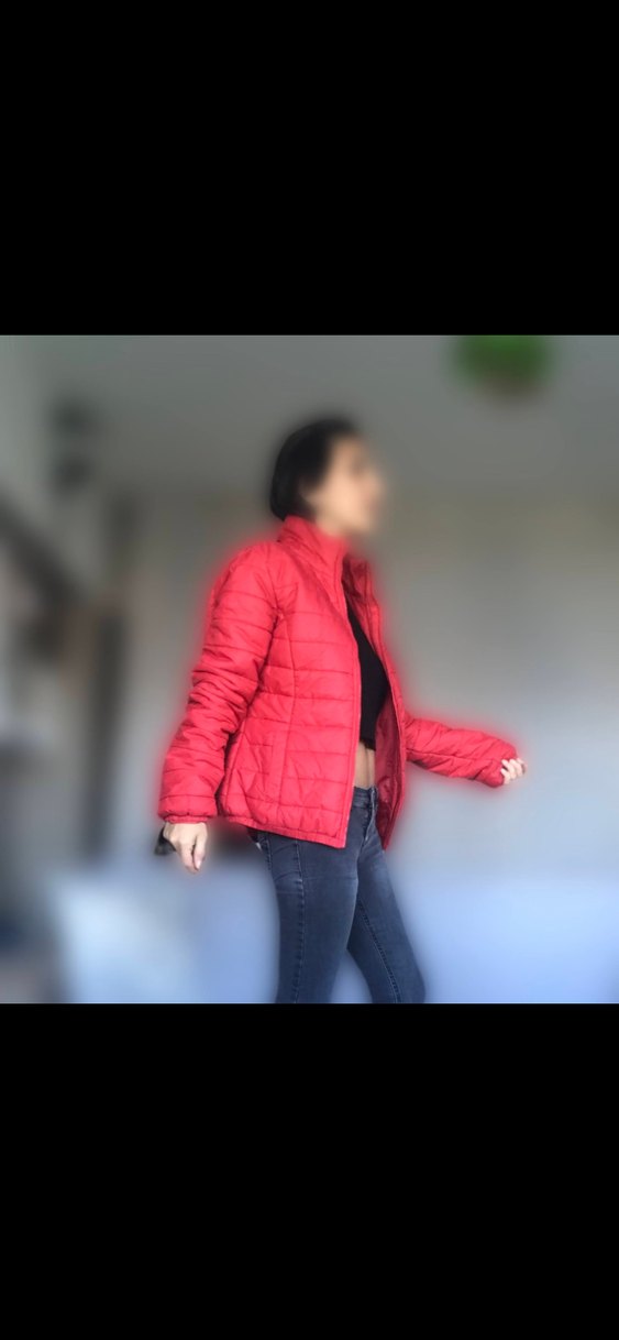 Parlak kırmızı renkte, fermuarlı ve yüksek yakalı kadın ceketi. Uzun kollu ve dar kesimdir, günlük sokak stiline uygundur.