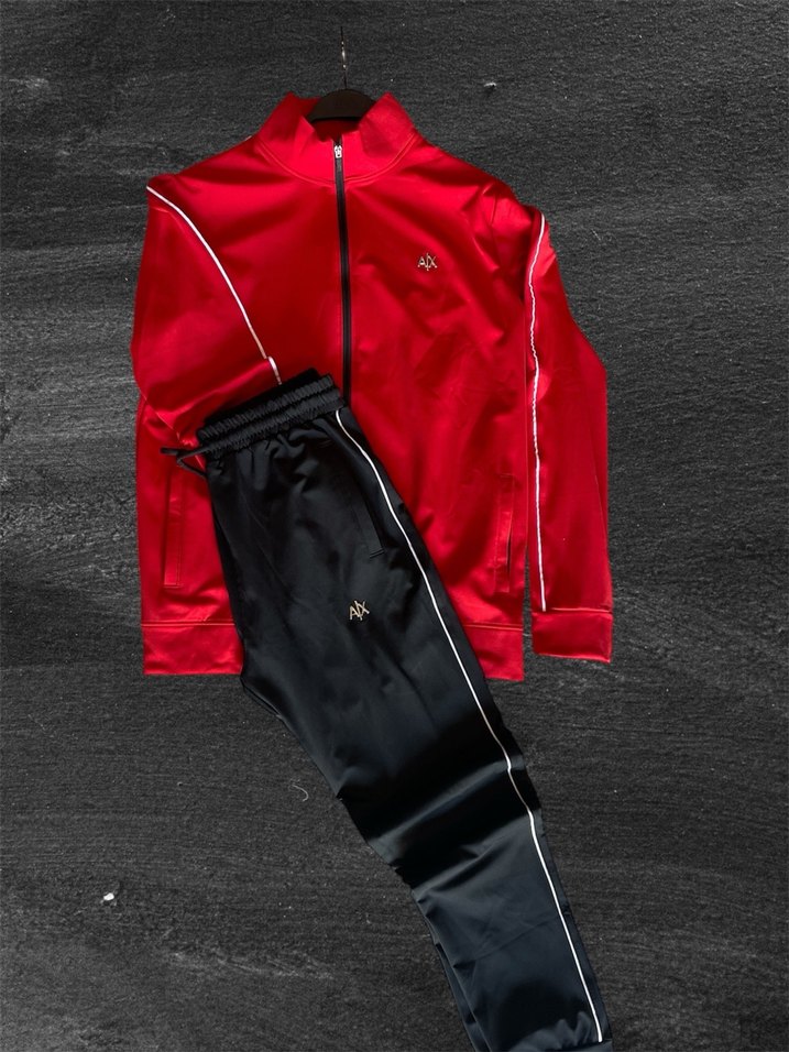 Fermuarlı ve uzun kollu kırmızı üst ile siyah pantolondan oluşan unixes eşofman takımı. Regular fit ve yakası kesimli, dış mekan ve sokak tarzına uygun.