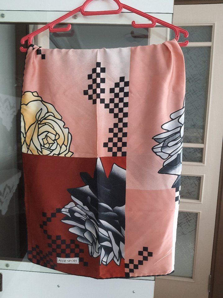 Karanlık kırmızı tonlarında, çağdaş ve avangard siyah beyaz çiçek desenli kadın fular. Yumuşak sentetik kumaştan, fermuarlı ve AKERSPORT etiketli.