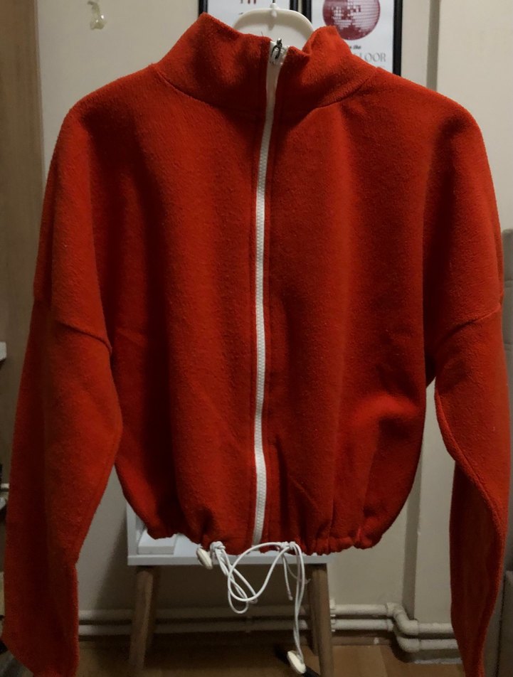 Kırmızı renkli, fermuarlı ve yüksek yakalı kadın hırka. Oversize durmasını istiyorsanız s veya m bedenler rahatlıkla tercih edebilir.