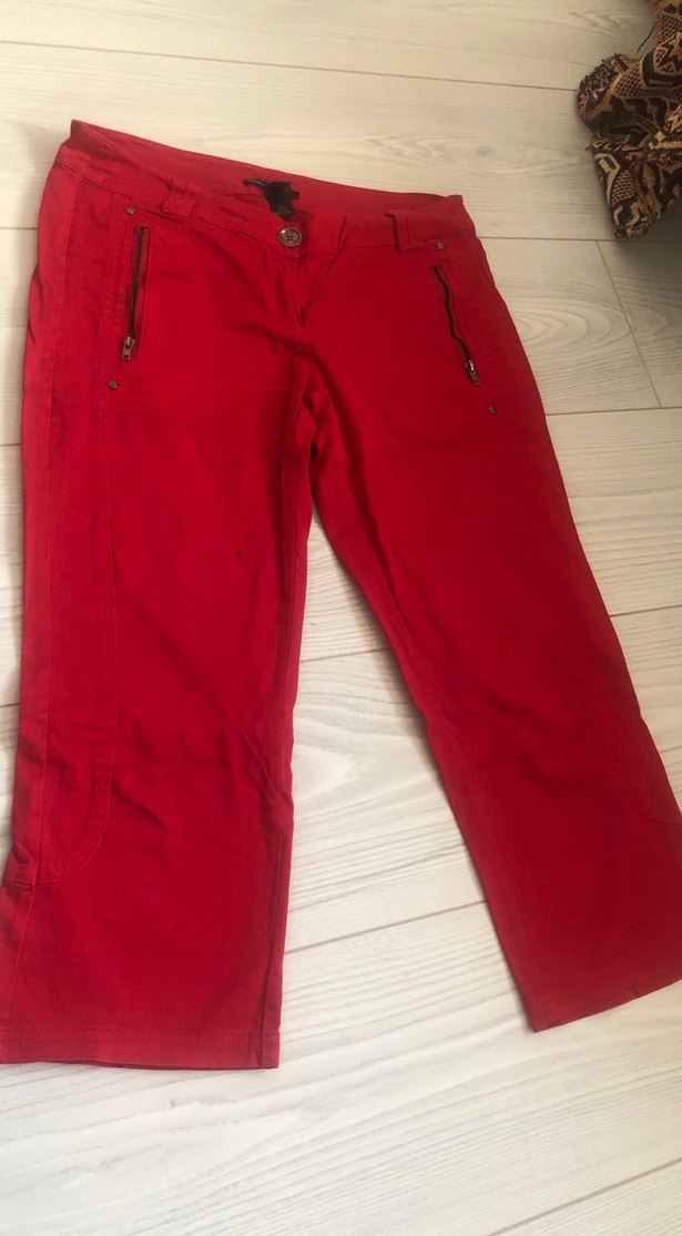 Kırmızı keten kumaştan, fermuarlı cepli ve midi boy, rahat ve şık sokak stili için ideal bir kadın pantolonu.