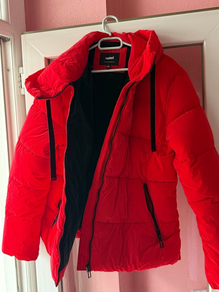 Kırmızı, fermuarlı, yumuşak kumaştan kadın kış montu. Notlu yaka ve uzun kollu, rahat ve şık dış mekan kullanımı için uygun.
