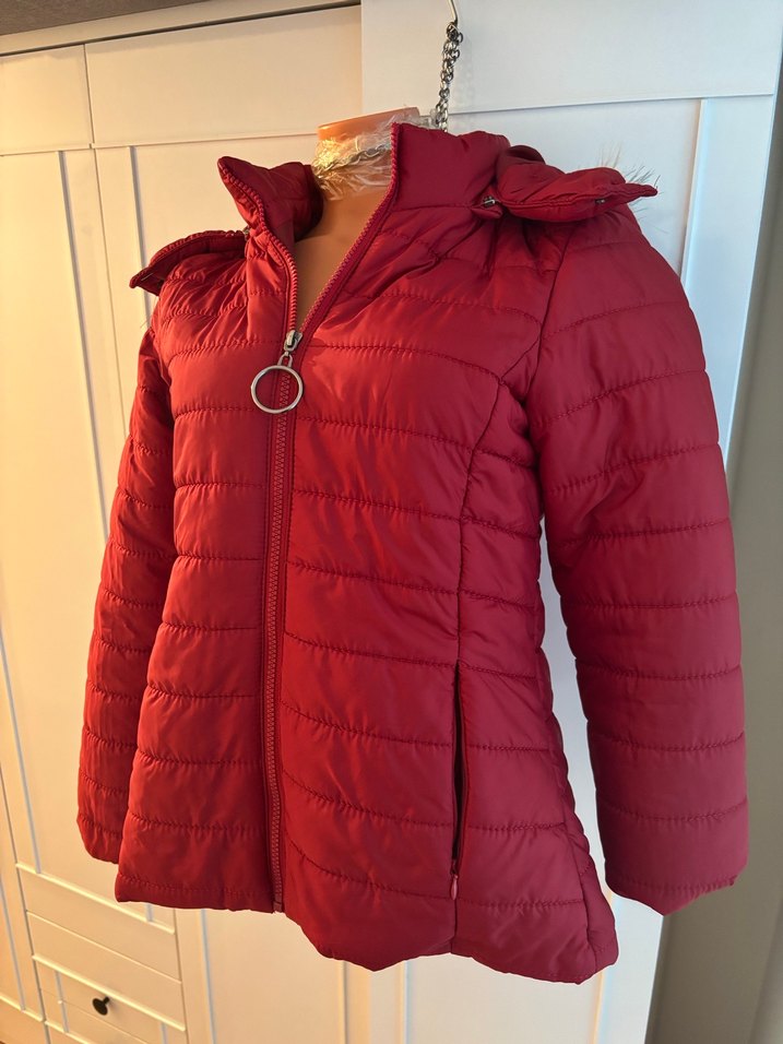 Internetten alındı, sayılı kullanıldı. Malzemesi 100% polyester. İçi elyaf dolgulu, sıcak tutar. Kapüşonlu model, çıkabilir, fermuarlar sağlam. Beden 36, kalıp normal. Göğüs 90, uzunluk 59, kol 62. Plastik manken 34 beden, ölçüleri 82-58-82 Kırmızı, fermuarlı ve yakalı kadın kışlık mont. Parlak, desensiz tasarımı, sokak stiline uygun rahat bir görünüm sunar. Normal boyda, sıcak tutan yumuşak kumaştan üretilmiştir. ❄️