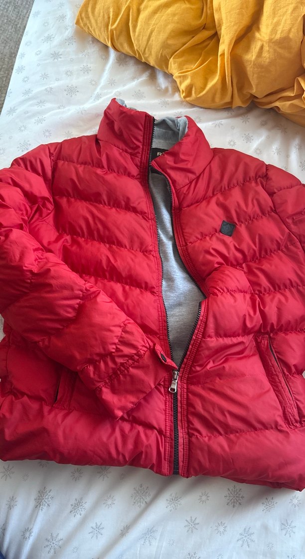 Kırmızı, parlak yüzeyli, yumuşak kumaştan yapılmış, fermuarlı, yüksek yakalı ve uzun kollu, normal midi boyda, dar kesim kadın kışlık mont. Tüm detayları yükledim sadece kolundaki arma da soyulma var