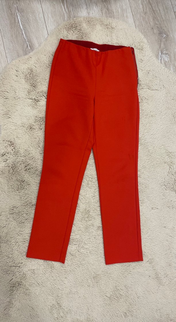 Kırmızı, parlak görünümlü, fermuarlı, normal boy midi kumaş pantolon. Rahat kesimiyle gündelik şıklık sunar.