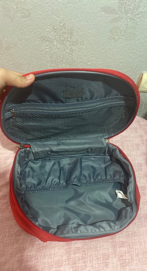 Kırmızı renkli, fermuarlı ve iç kısmında düzenleyici cepleri bulunan kadın makyaj çantası. Günlük kullanım için uygun sentetik kumaş.