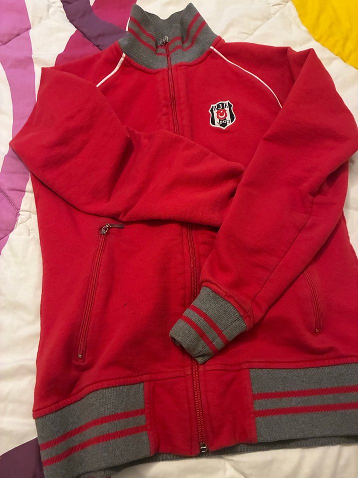 Yumuşak kumaştan yapılmış, fermuarlı ve cep detaylı, yüksek yakalı ve uzun kollu kırmızı spor ceket. Gri çizgili manşet ve etek ucu ile sportif tarz sunar.