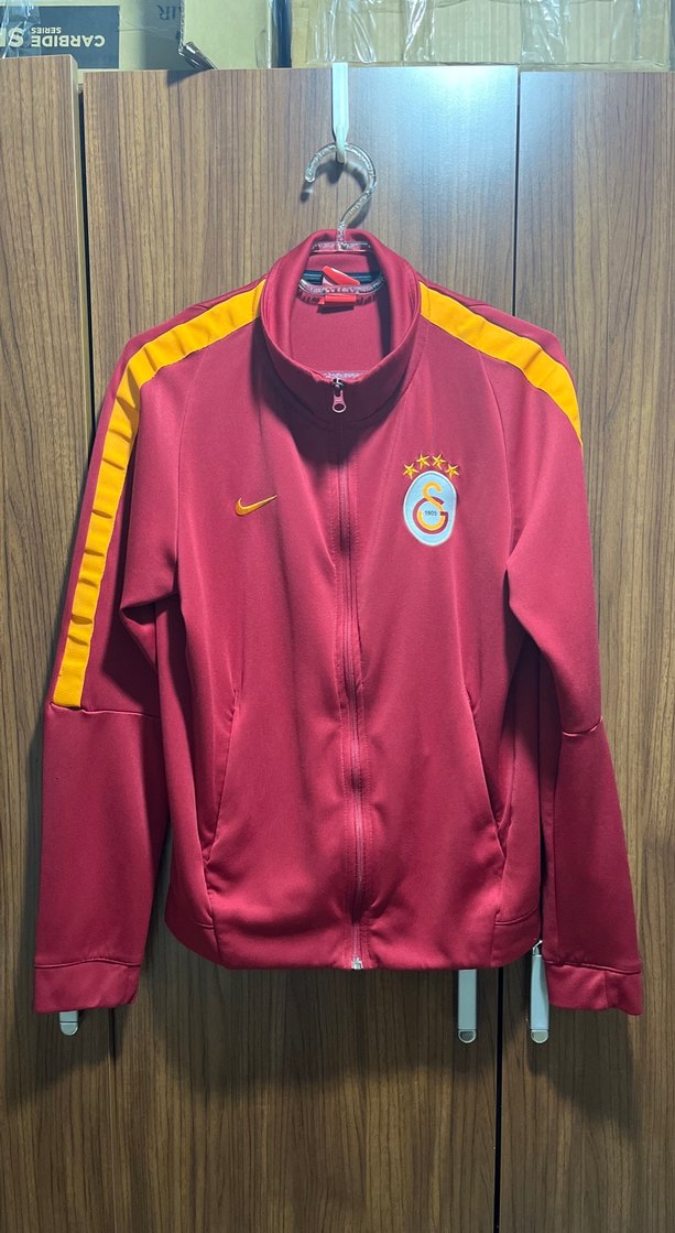 Kadınlar için fermuarlı, uzun kollu, bisiklet yaka spor ceketi. Yumuşak kırmızı kumaş, sarı omuz şeritleriyle sportif ve şık görünüme uygundur.