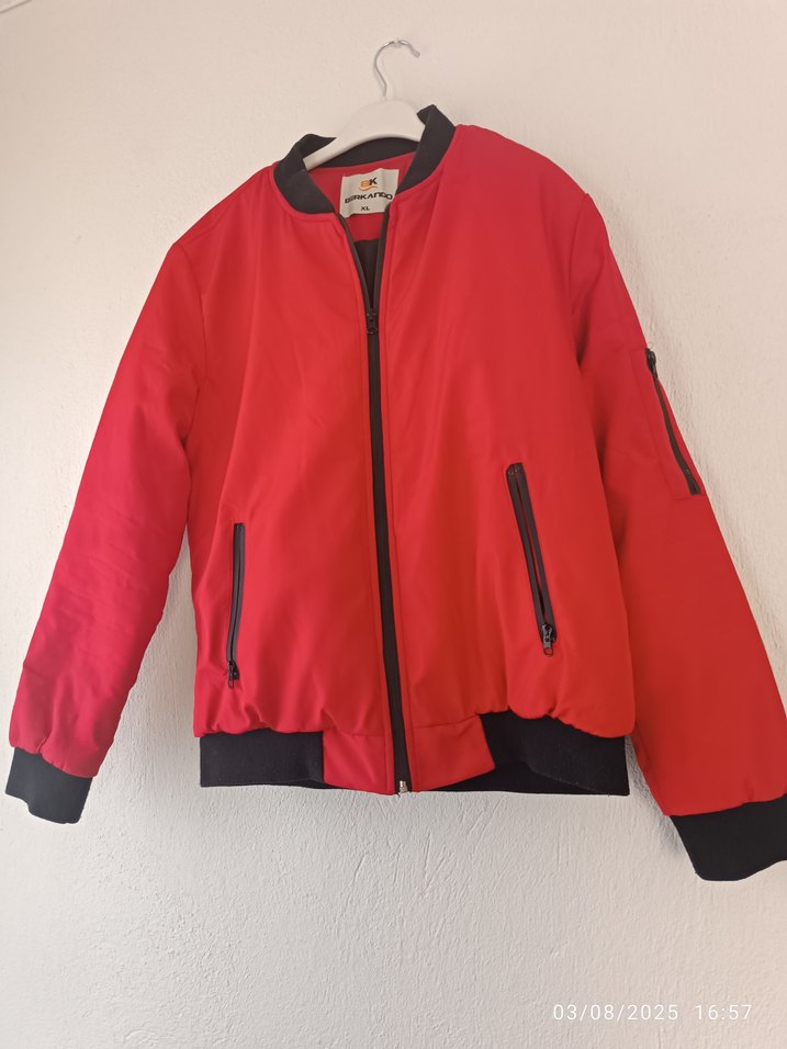 Kırmızı renkli, fermuarlı cepleri ve ön fermuarı olan, bisiklet yaka, uzun kollu, rahat kesim kadın spor montu. Yumuşak ve sıcak kumaştan üretilmiştir.