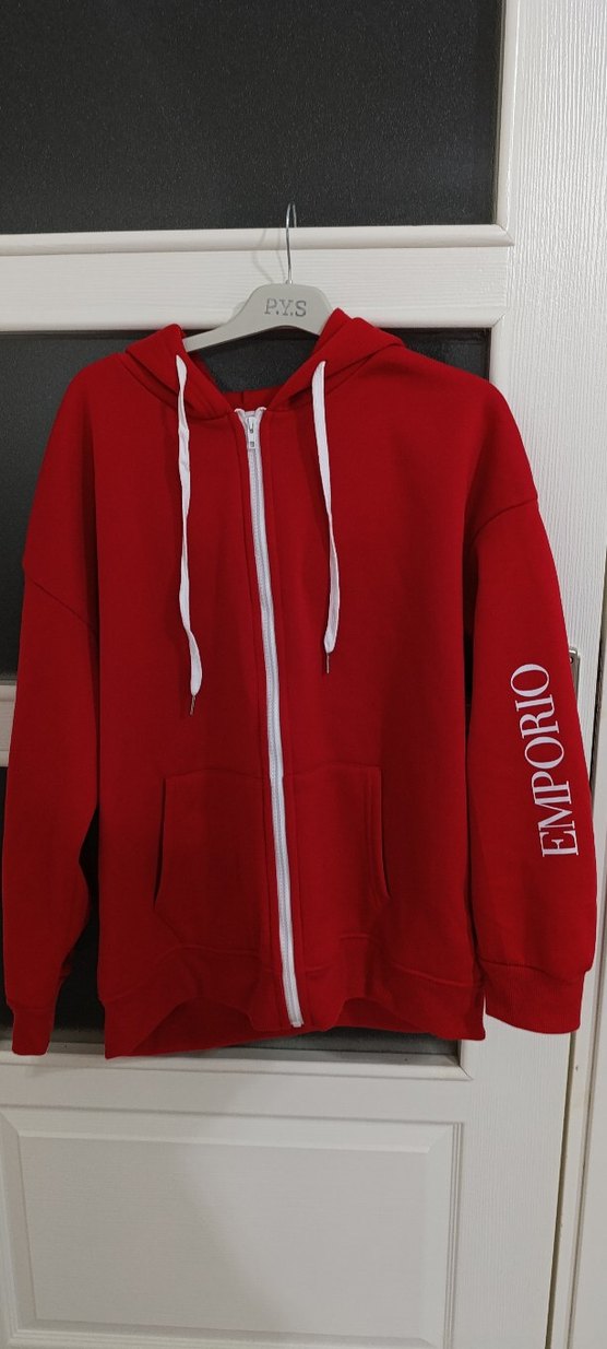 Kırmızı fermuarlı sweatshirt, uzun kollu ve yuvarlak yaka. Kolunda baskılı detaylar bulunur, rahat ve bol kesim, midi boyda, günlük sokak stili için uygundur.