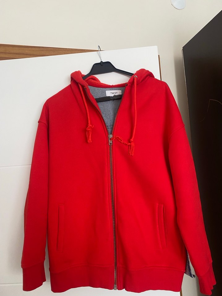 Kırmızı, fermuarlı, uzun kollu, yuvarlak yaka, bol kesim kadın sweatshirt. Yumuşak kumaştan, günlük sokak stiline uygun.