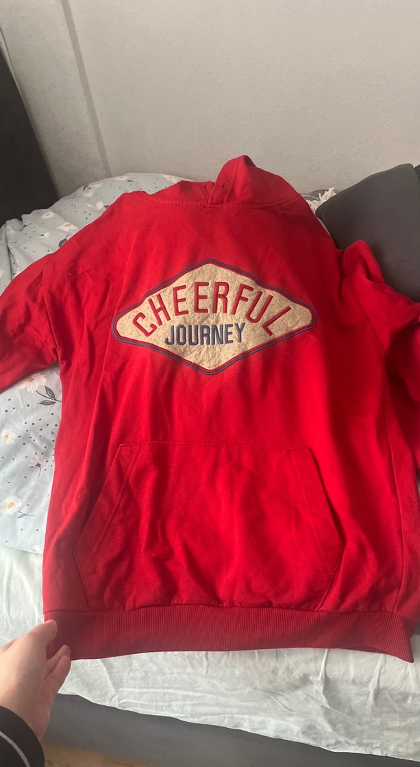 Kırmızı renk, uzun kollu, fermuarlı ve bol kesim kadın sweatshirt. Yumuşak ve sıcak kumaştan üretilmiş, 'CHEERFUL JOURNEY' baskılı tasarımıyla günlük ve sokak stiline uygun.