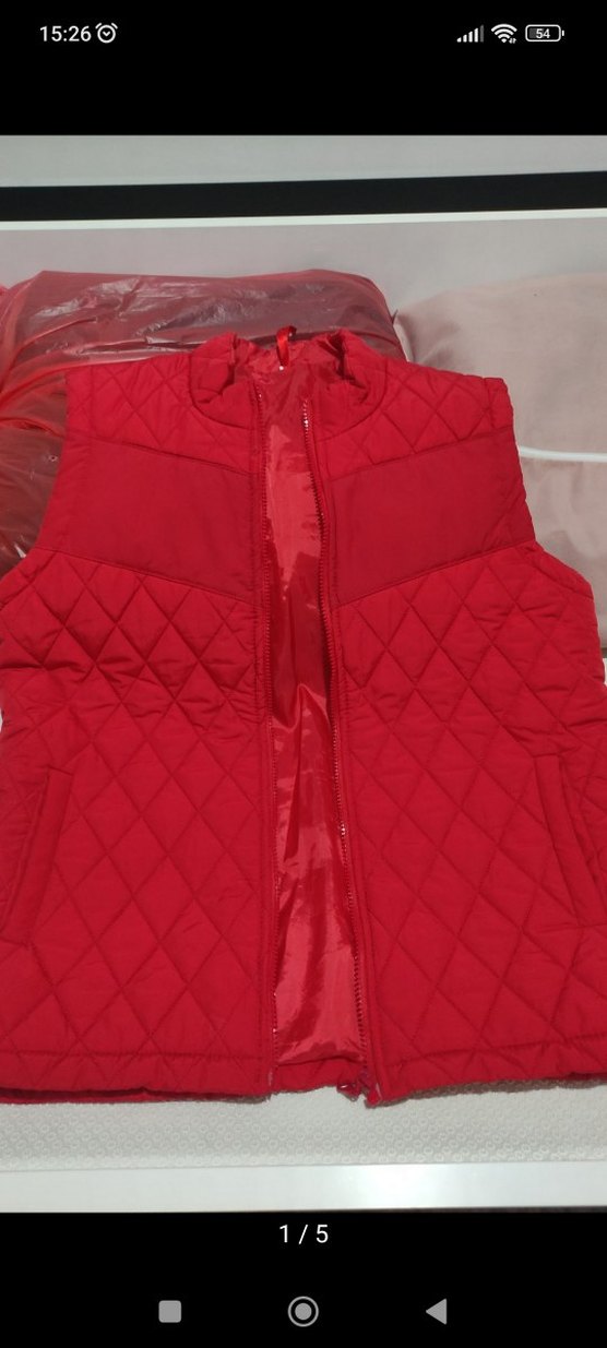 Kırmızı parlak renkte, fermuarlı ve V yakalı, kolsuz kadın yeleği. Sentetik kumaştan, normal midi boyda, trend sokak tarzı için uygun.