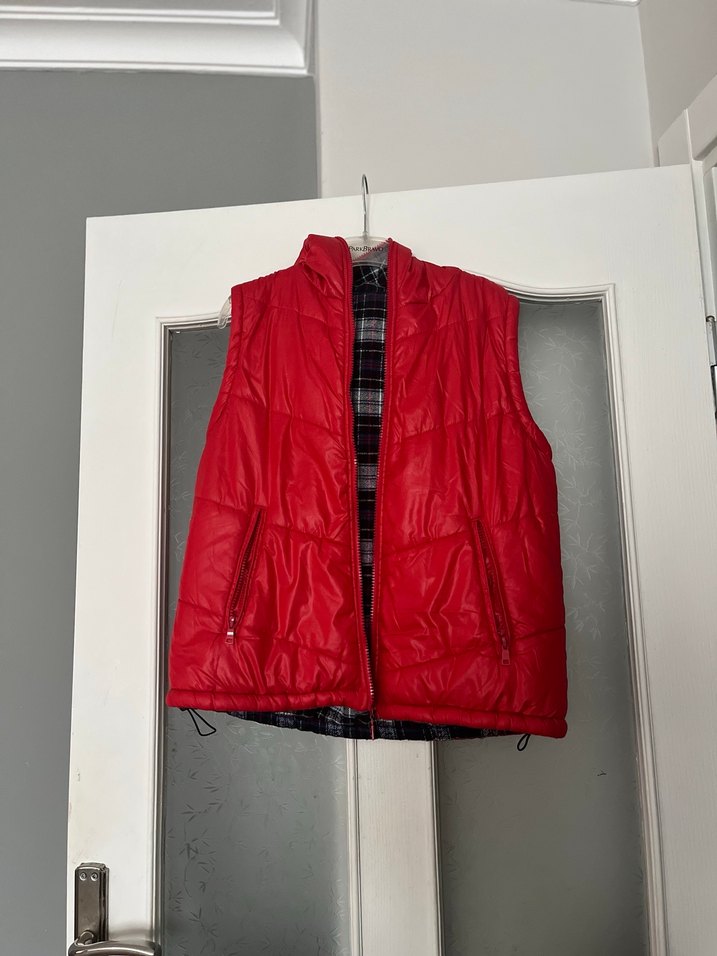 Kırmızı, fermuarlı cep detaylı, kolsuz, halter yaka kadın yelek, yumuşak ve sıcak kumaştan üretilmiştir, günlük rahat kullanım için uygundur.