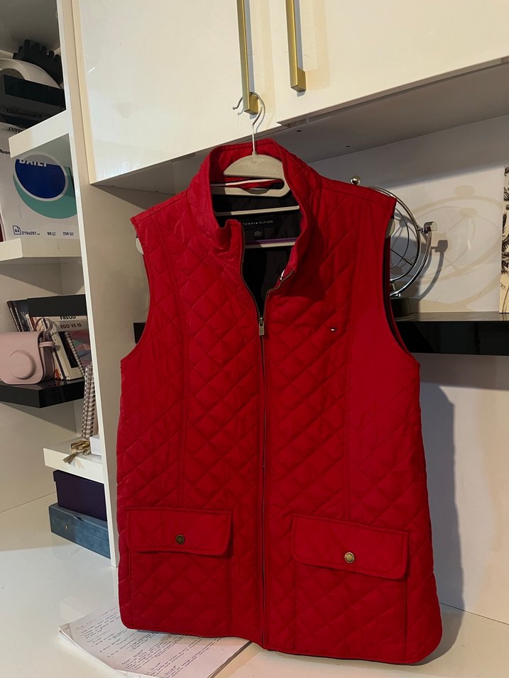 Koyu Kırmızı,fermuarlı ve iki cepli, yüksek yakalı, normal boyda regular fit kadın yelek. Rahat sokak stiline uygun. Xl bedendir. Tommyden alındı ve sıfırdır hicbir sorunu yok. Simdiden hayırlı olsun