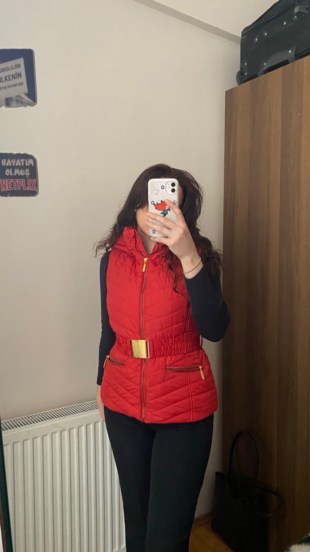 Kırmızı, kolsuz, fermuarlı ve yüksek yakalı bu kaban, parlak görünüme ve yumuşak, sıcak kumaşa sahiptir. Günlük sokak stiline uygundur.