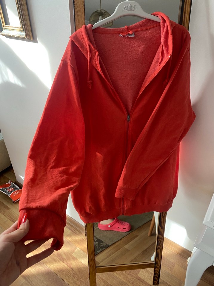 Parlak kırmızı renkte, kapüşonlu ve fermuarlı kadın sweatshirtü. Bol kesim, uzun kollu ve yumuşak, sıcak kumaştan, günlük sokak stili için uygun.