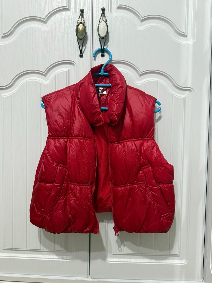 Kırmızı, fermuarlı, yüksek yakalı ve kısa kesim kadın yelek. Yumuşak ve sıcak kumaştan yapılmıştır, dış mekan kullanımı için uygundur.