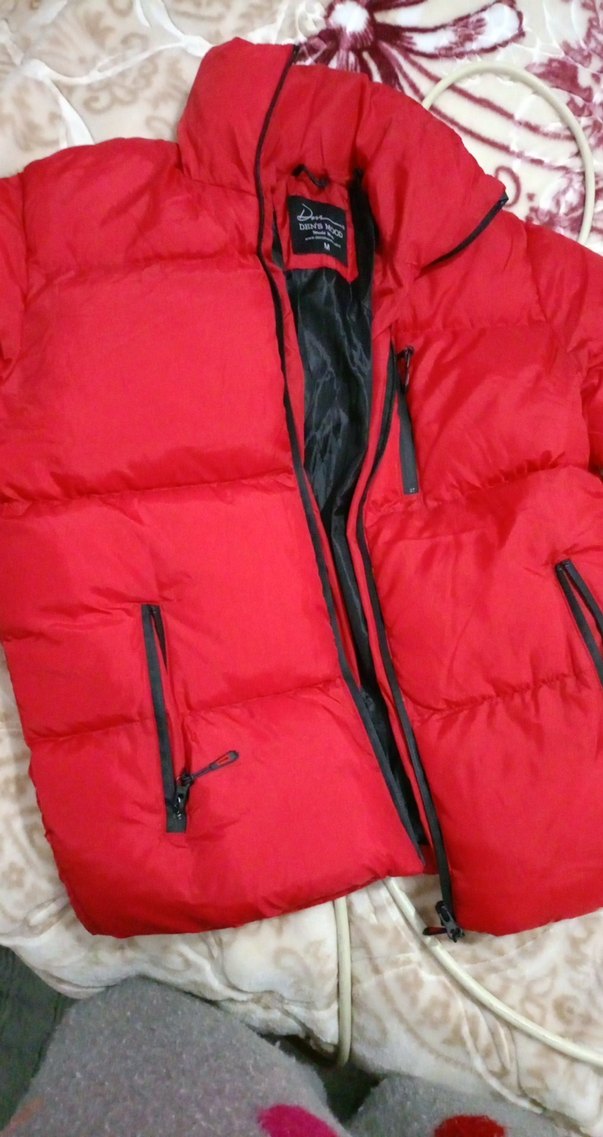 Kırmızı, fermuarlı ve normal boy erkek mont iç kısmında yırtık var onun harici bir şeyi yok