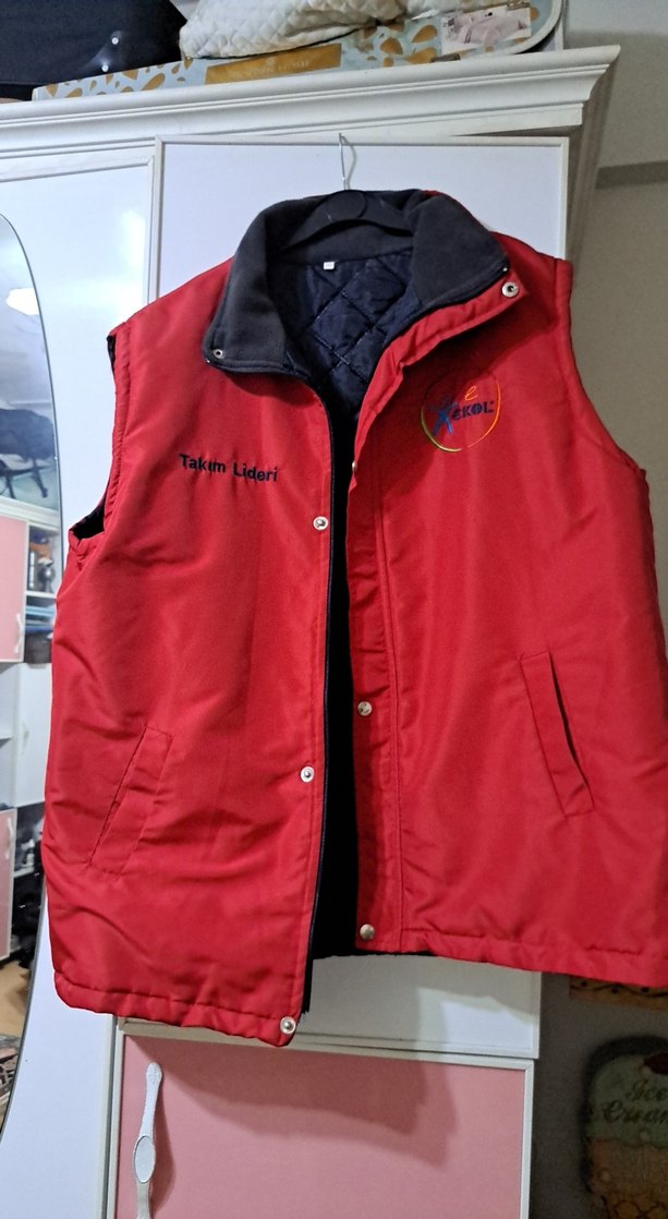 Parlak kırmızı renkte, yumuşak kumaştan yapılmış, fermuarlı ve kolsuz mini ceket. Yüksek yakalı ve baskılı, rahat kesim, günlük sokak stiline uygun. Üzerinde "Takim Lideri" yazısı bulunur.