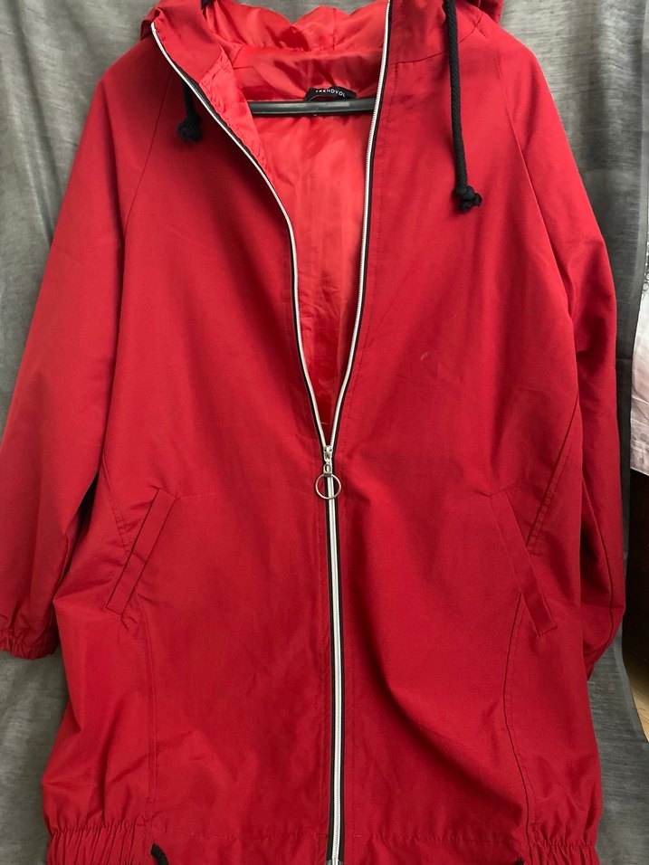 Kırmızı renkli, fermuarlı, notched lapel yakalı, bol kesim ve midi uzunlukta kadın ceketi. Uzun kollu ve yumuşak, sıcak kumaştan üretilmiştir.
