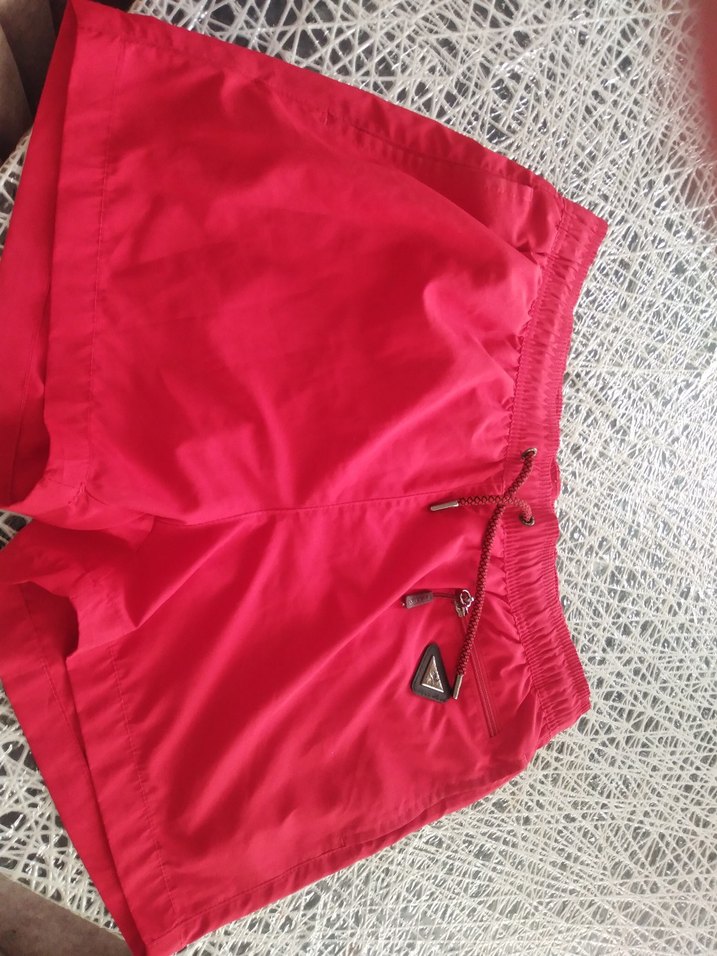 Kırmızı, fermuarlı, bol kesim mini erkek mayo şortu. Desensiz, plaj ve sokak stiline uygun. ALY markalı.