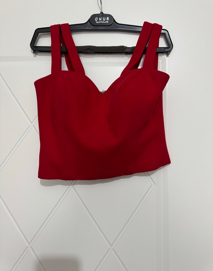 Kırmızı, kolsuz ve vücuda oturan bu büstiyer, arka fermuar detayına sahiptir. Etek beli yüksek olup aşırı açık bir görüntüsü yoktur alt etek kısmı önden 2 parça yırtmaçlıdır hiç bir sorunu yoktur