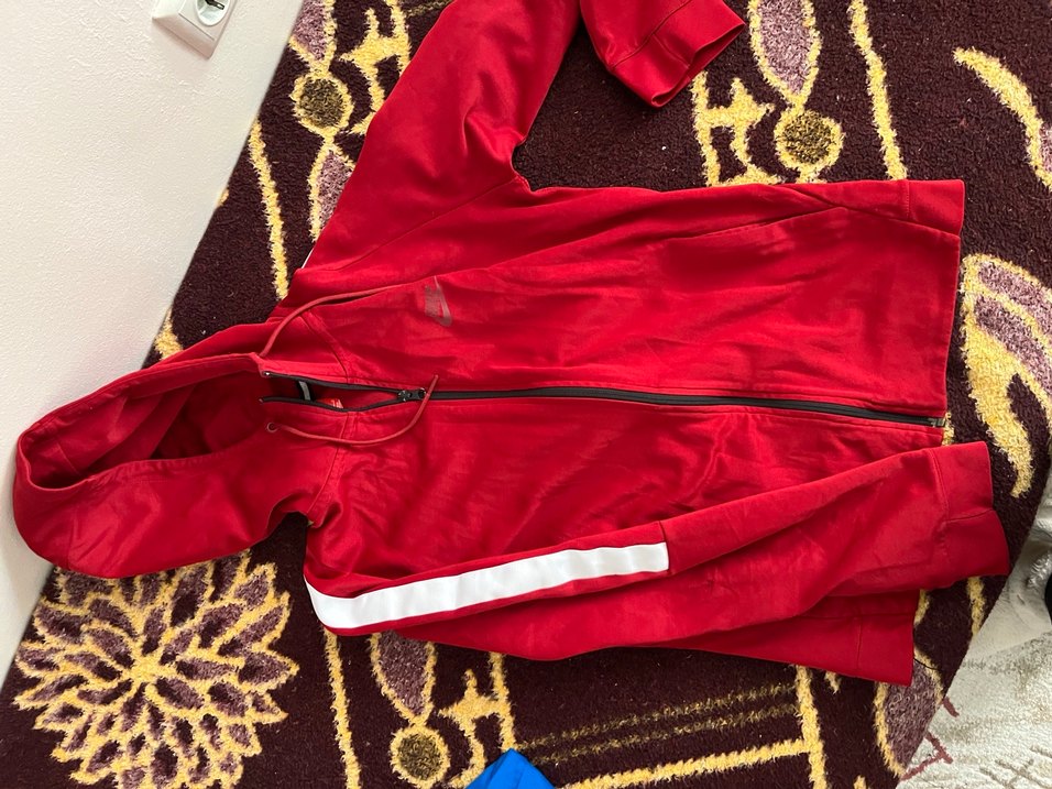 Kırmızı, fermuarlı, kapüşonlu ve uzun kollu kadın sweatshirt. Beyaz şerit detaylı, rahat ve sıcak kumaştan, dış mekan sokak giyimi için uygundur. ♀️