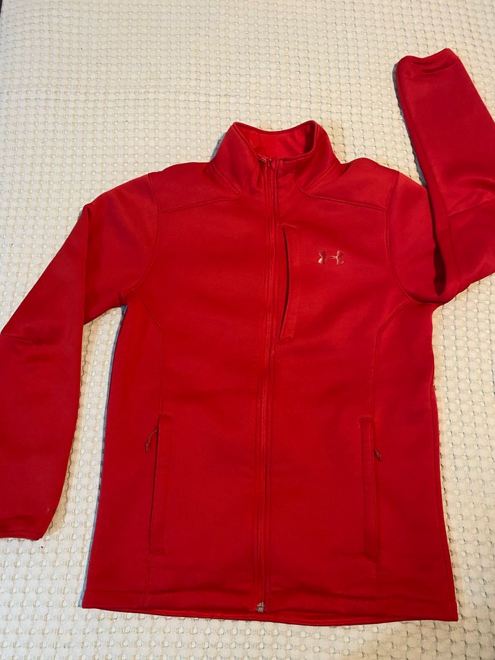 Yumuşak ve sıcak kumaştan yapılmış, fermuarlı cepli, uzun kollu, yüksek yaka ve fitted kırmızı dış mekan ceketi. Cepleri fermuarlı