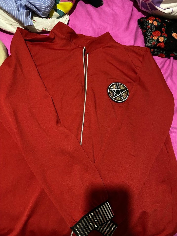 Uzun kollu, fermuarlı kırmızı kadın tunik . Nakışlı yıldız detayı ve parlak yüzeyiyle şık ve rahat bir seçenek.