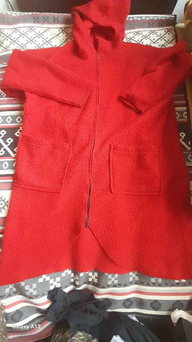 Yumuşak ve sıcak kumaştan üretilmiş, uzun ve bol kesim kırmızı kadın kabanı, fermuarlı ve yakası çıtçıtlıdır. Günlük kullanım için uygundur ve rahatlık sağlar.