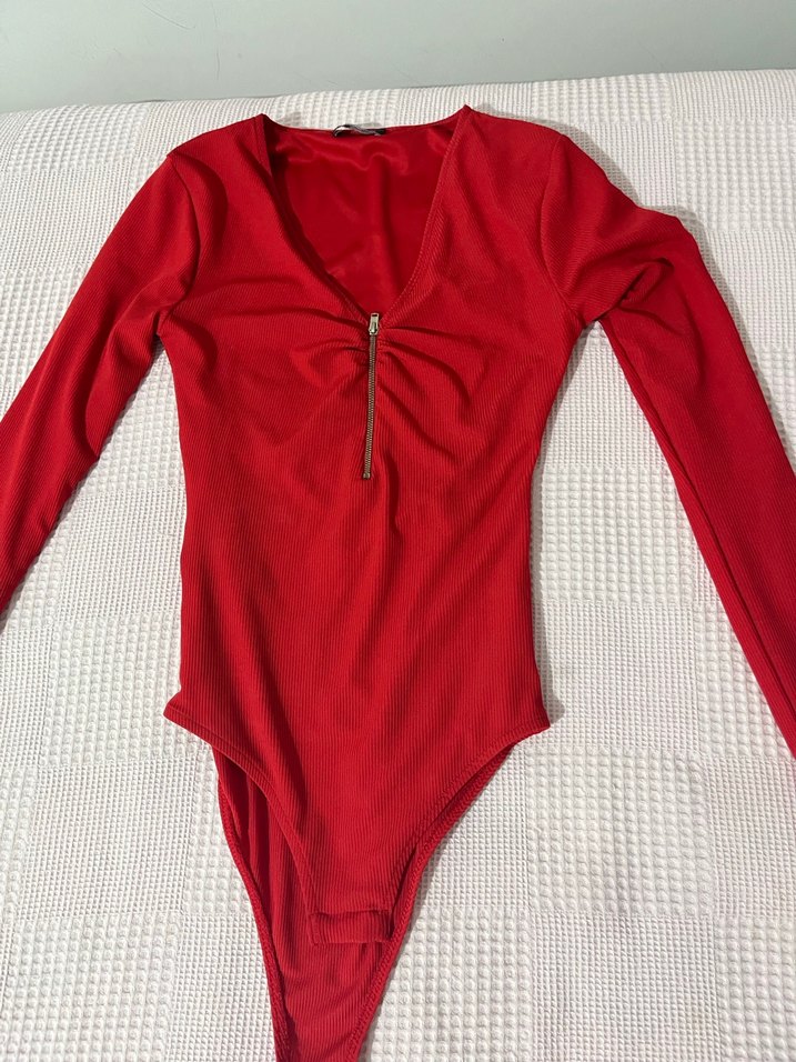 Parlak kırmızı renkte, V yakalı ve fermuarlı uzun kollu, vücuda oturan kadın bluz. Sentetik kumaştan, midi boyda, günlük ve streetwear tarzına uygun.
