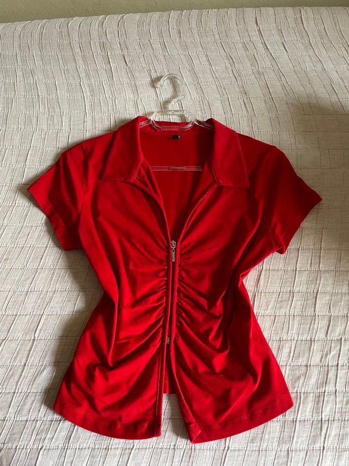 Kırmızı Fermuarlı V Yaka Kısa Kollu Bluz