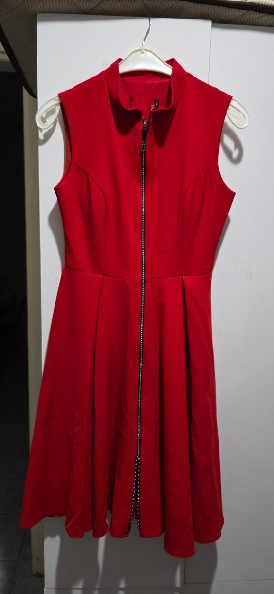 Kırmızı, parlak ve fermuarlı bu v yaka midi elbise, kolsuz ve vücuda oturan kesime sahiptir. Ofis için cesur streetwear tarzına uygundur.