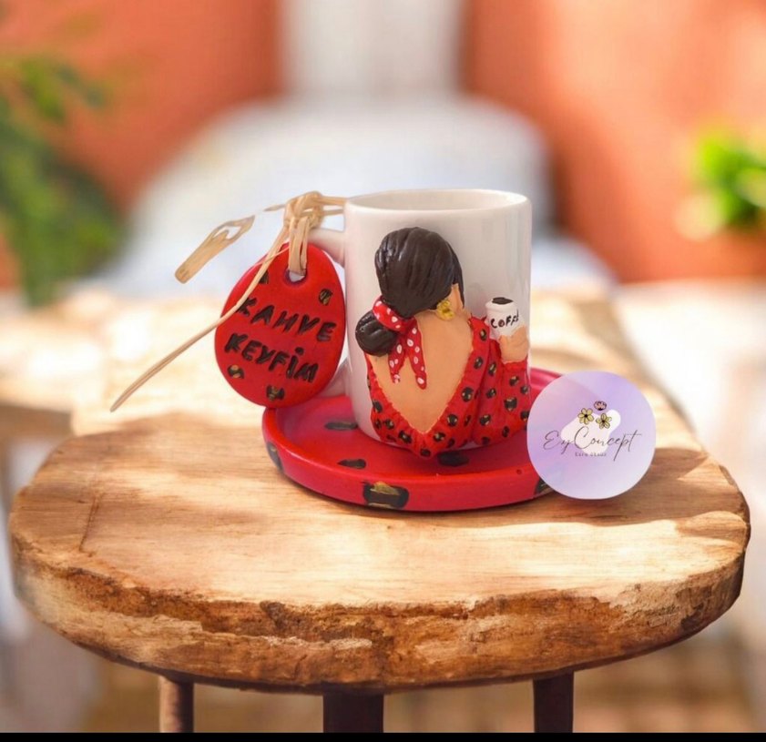 Kırmızı elbiseli kadın figürlü kahve fincanı, uyumlu kırmızı tabak ve dekoratif etiketle birlikte sunuluyor. ☕️