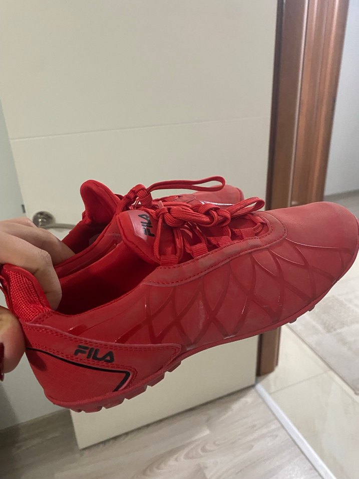 Kırmızı FILA spor ayakkabı, parlak yüzey ve Velcro detaylı. İnce topuklu, sportif ve sokak stiline uygun, desensiz tasarım.