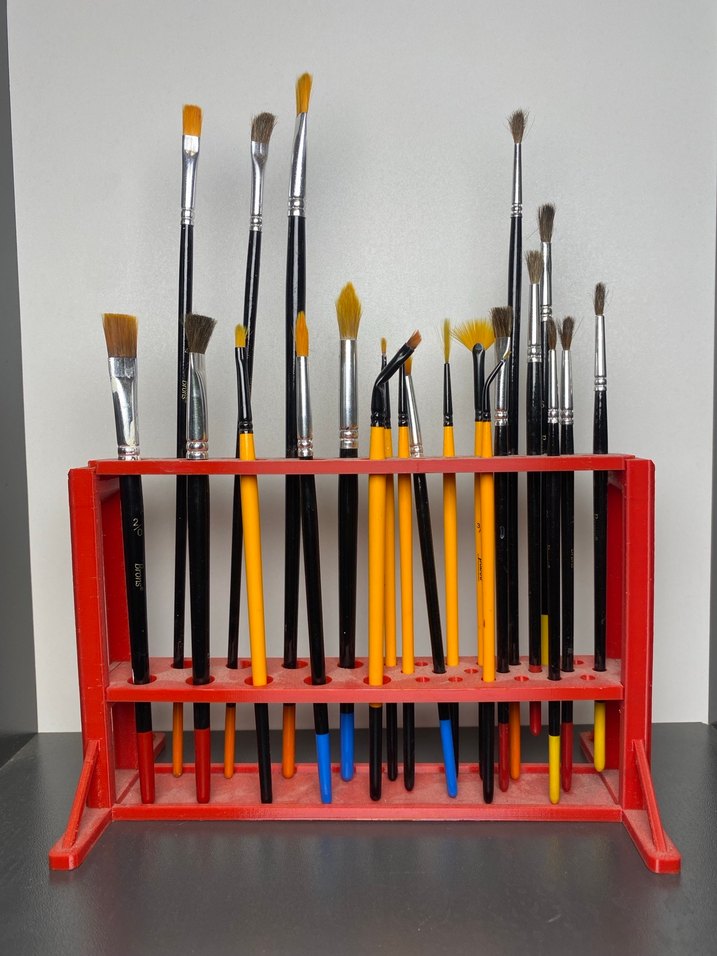 Çeşitli şekil ve boyutlarda boya fırçalarını düzenleyen kırmızı fırça tutucu. PETG filamenttir kalitelidir sağlam yapısı vardır