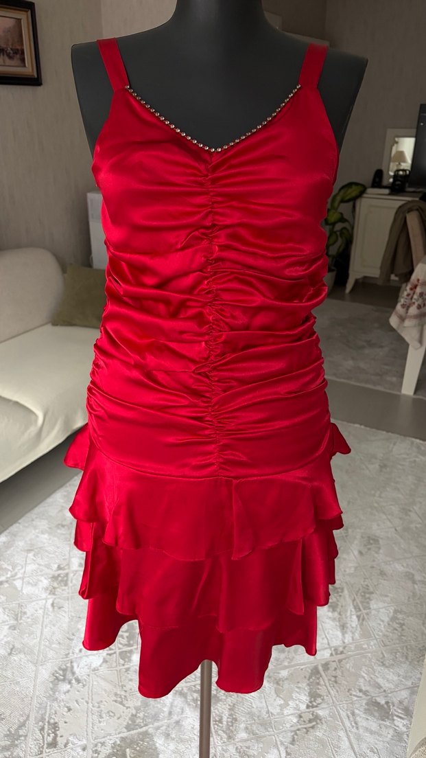 Parlak saten kumaşı ve zarif taş detaylarıyla göz alıcı bir elbise! Askılı tasarımı ve V yaka kesimiyle şık bir görünüm sunar. Bel kısmındaki büzgü ve etek ucundaki üç kat fırfır detayı, elbiseye hareket ve hacim kazandırır. 14-15 yaş aralığı için uygundur. Yandan fermuarlı olup kolay giyilip çıkarılabilir. Özel günler, davetler, mezuniyet, doğum günü kutlamaları için mükemmel bir seçim! ❤️