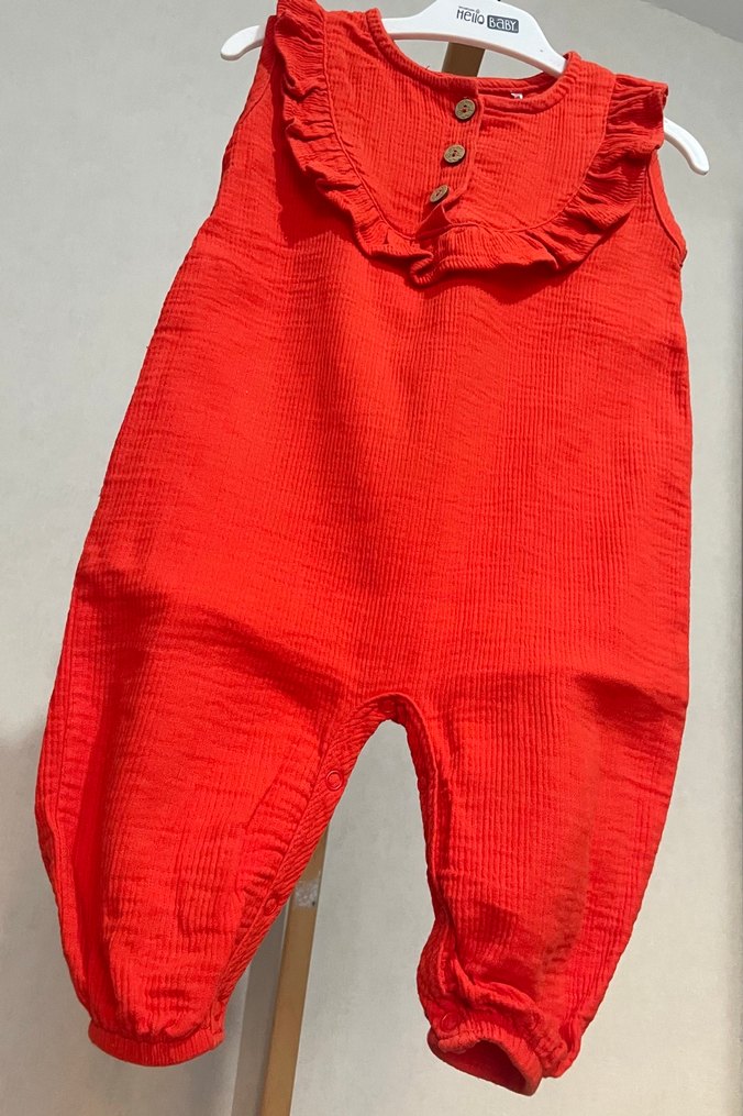Canlı kırmızı renkte, yaka kısmında fırfır detaylı, düğmeli ve desensiz bebek kız tulumu.