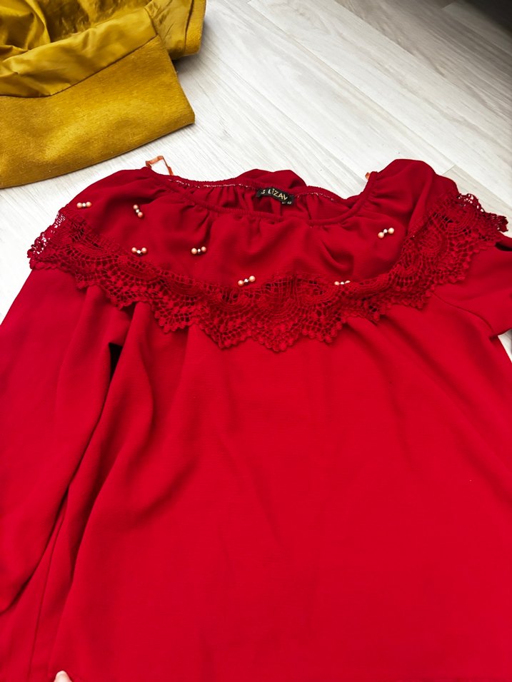 Kırmızı renkte, fırfırlı ve nakış detaylı, kayık yaka uzun kollu bol kesim midi boy bluz. Yumuşak sentetik kumaştan yapılmıştır. Romantik akşamlar için uygun.
