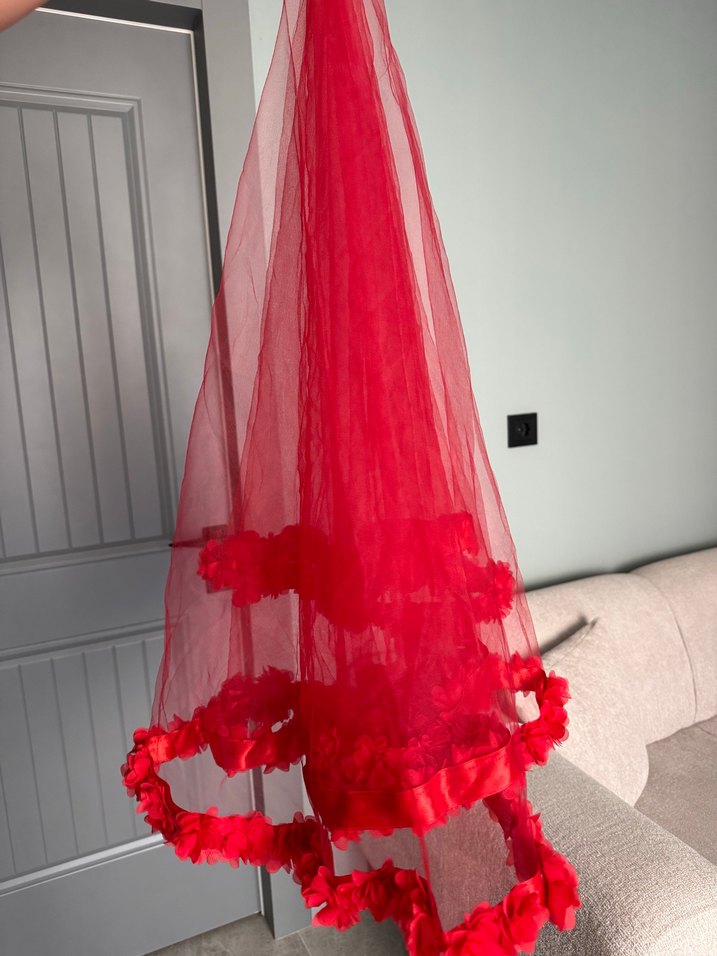 Kırmızı renkli, katmanlı fırfır detaylarıyla gotik ve avangart tarzda dikkat çeken düğün duvağı.
