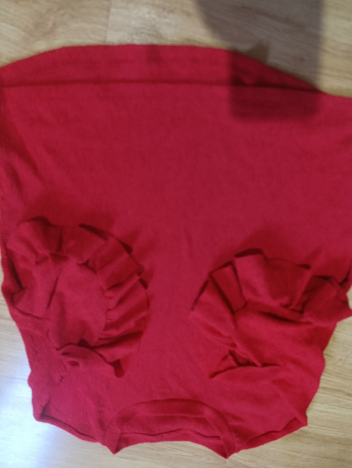 Kısa kollu, bisiklet yakalı kırmızı hamile tişörtü. Parlak sentetik kumaştan yapılmış, fırfır detayları bulunur. Parti için uygundur.